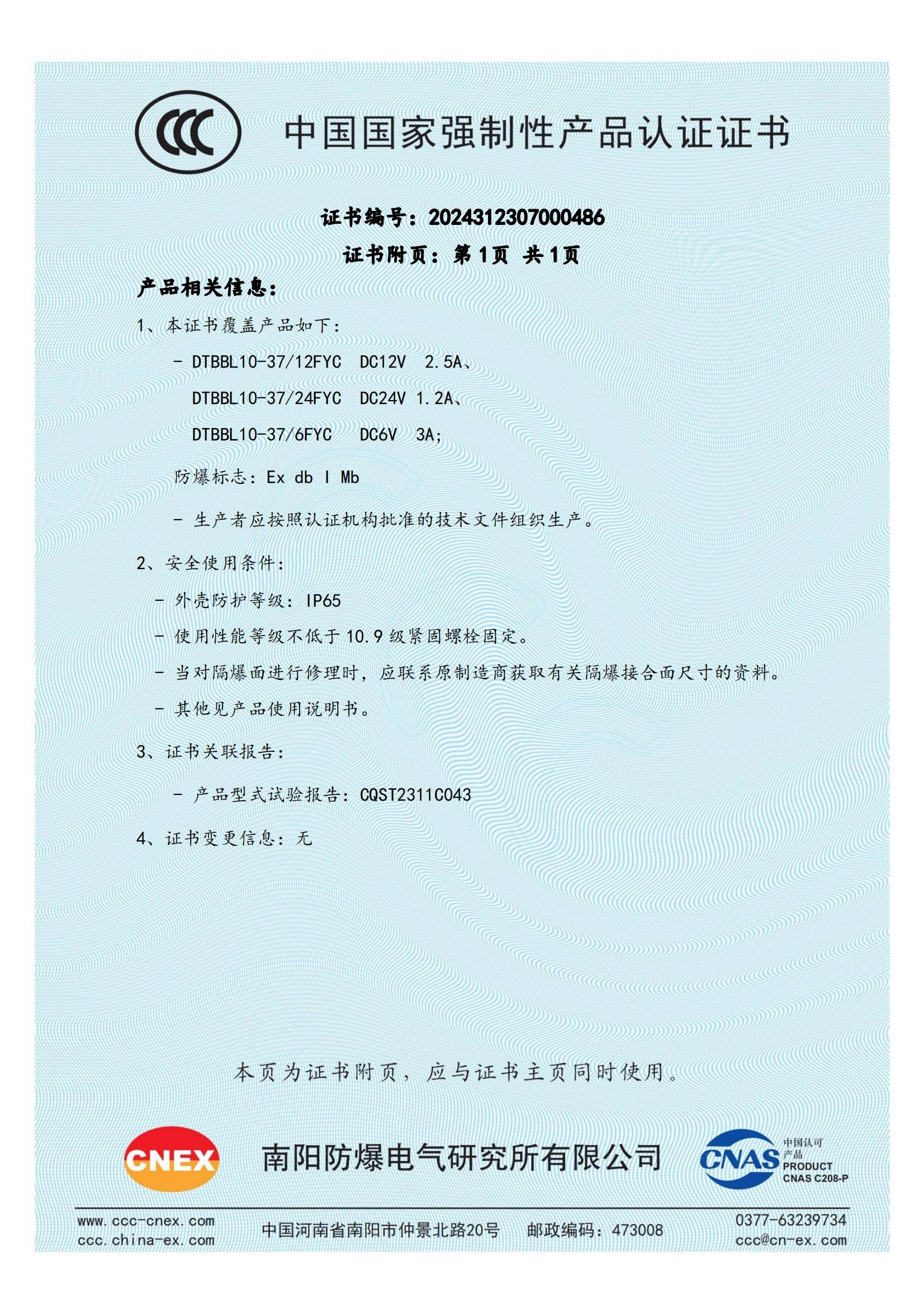 2024312307000486 礦用隔爆型液壓閥用比例電磁鐵CCC證書 DTBBL10-37FYC_01