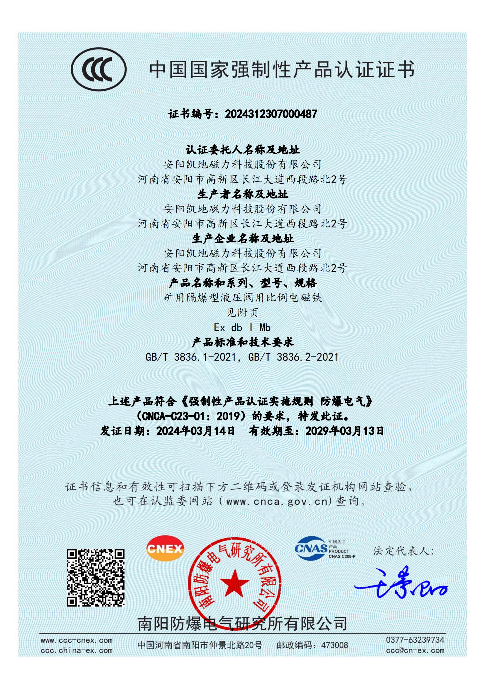 2024312307000487 礦用隔爆型液壓閥用比例電磁鐵 DTBBL10-90FYC CCC證書_00